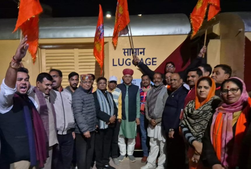बीकानेर newsbhartibikaner.com/ केंद्रीय कानून मंत्री बीकानेर सांसद अर्जुनराम मेघवाल के सहयोग से आस्था स्पेशल ट्रेन देर रात्रि बीकानेर से अयोध्या के लिए 1344 यात्रियों के साथ रवाना हुई इस ट्रेन से अयोध्या के लिए रवाना होने वाले राम भक्तों का उत्साह देखते ही बन रहा है पूरा स्टेशन परिसर जय जय श्री राम के नारों से गूंज उठा वहीं ट्रेन के भीतर भी कोई जय जय श्री राम के जयकारे लगा रहा है तो हनुमान चालीसा का पाठ पढ़ रहा है राम भक्तों की टोली में बच्चों से लेकर बुजुर्गों तक शामिल है। इस दौरान बड़ी संख्या में भाजपा के कार्यकर्ता भी स्टेशन पहुंचे। तेजाराम मेघवाल ने बताया इस ट्रेन के संचालन से बीकानेर से हजारों रामभक्त आज बीकानेर से अयोध्या के लिए रवाना हुए इस आस्था ट्रेन में रामभक्तों को खाने पीने की ओर अयोध्या धाम में रहने की सहूलियत मिलेगी। बीकानेर रेलवे स्टेशन से भाजपा प्रदेश महामंत्री जगबीर छावा, जिलाध्यक्ष विजय आचार्य, महापौर सुशीला कंवर राजपुरोहित, विधायक विश्वनाथ मेघवाल, जेठानंद व्यास ने अयोध्या धाम के लिए आस्था स्पेशल ट्रेन को हरी झंडी दिखाकर रवाना किया है। केंद्रीय मंत्री अर्जुनराम मेघवाल ने इस अवसर पर दूरभाष के माध्यम से सभी रामभक्तो को शुभकामना देते हुए कहा श्रीराम का मंदिर हमारी संस्कृति, शाश्वत आस्था, राष्ट्रीय भावना, लोगों की सामूहिक संकल्प शक्ति का भी प्रतीक बनेगा। कहा कि यह मंदिर आने वाली पीढ़ियों को आस्था, श्रद्धा व संकल्प की प्रेरणा देता रहेगा जिनके त्याग, बलिदान व संघर्ष से वर्षों पुराना ये सपना साकार हुआ उनकी तपस्या राम मंदिर में नींव की भांति जुड़ी हुई है आज हर कोई भगवान श्रीराम के दर्शन को लालायित है। प्रदेश महामंत्री जगवीर छावा ने कहा प्रधामंत्री नरेंद्र मोदी की इच्छाशक्ति से ये संभव हुआ रामलला टेंट से आज भव्य मंदिर में विराजमान है आप सभी भाग्यशाली है इस आस्था स्पेशल ट्रेन के माध्यम से आप सभी इस मंदिर के साक्षी बनने जा रहे है श्री राम का आशीर्वाद आप सभी पर बना रहे आपकी यात्रा शुभ और यादगार रहे। शहर जिलाध्यक्ष विजय आचार्य ने कहा जब स्टेशन में प्रवेश कर रहे थे तो रामभक्तों के चेहरों पर दिखे भाव को शब्दों में बया करना संभव नहीं है। इस अवसर पर भाजपा प्रदेश कार्यकारणी सदस्य सत्यप्रकाश आचार्य, महामंत्री श्याम सुंदर चौधरी, नरेश नायक, मोहन सुराणा, उपाध्यक्ष आनंद सिंह भाटी, विजय उपाध्याय, मंत्री मनीष सोनी, प्रवक्ता अशोक प्रजापत, पंकज अग्रवाल, विक्रम राजपुरोहित के साथ सैंकड़ों की संख्या में भाजपा कार्यकर्ता उपस्थित रहे।