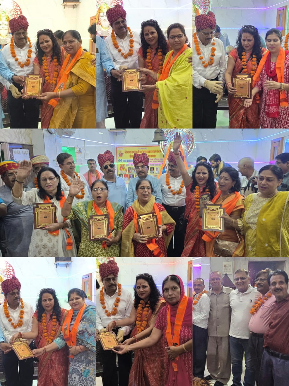 newsbhartibikaner.com बीकानेर लोकदेवता बाबा रामदेव जी की दशम पर सदर थाना गली नम्बर 4 में स्थित बाबा रामदेव जी मंदिर के प्रांगण आरती के बाद रत खाना कॉलोनी स्थित झूलेलाल मंदिर में बाबा की जयकारे की उद्घोष के साथ बाबा रामदेव जी एवं पूनरासर मेले में पैदल पदयात्रियों की मार्ग में सेवादार के रूप में सेवा करने वाले 51 बाबे के भक्त सेवादारों का मित्र एकता सेवा समिति द्वारा सम्मान किया गया। इसमें पीबीएम स्थित बाबा रामदेव निशुल्क भोजन सेवा ट्रस्ट की पांच दबंग नारी शक्ति का दुपट्टा माला और मोमेंट तो देखकर साथ सम्मान किया गया