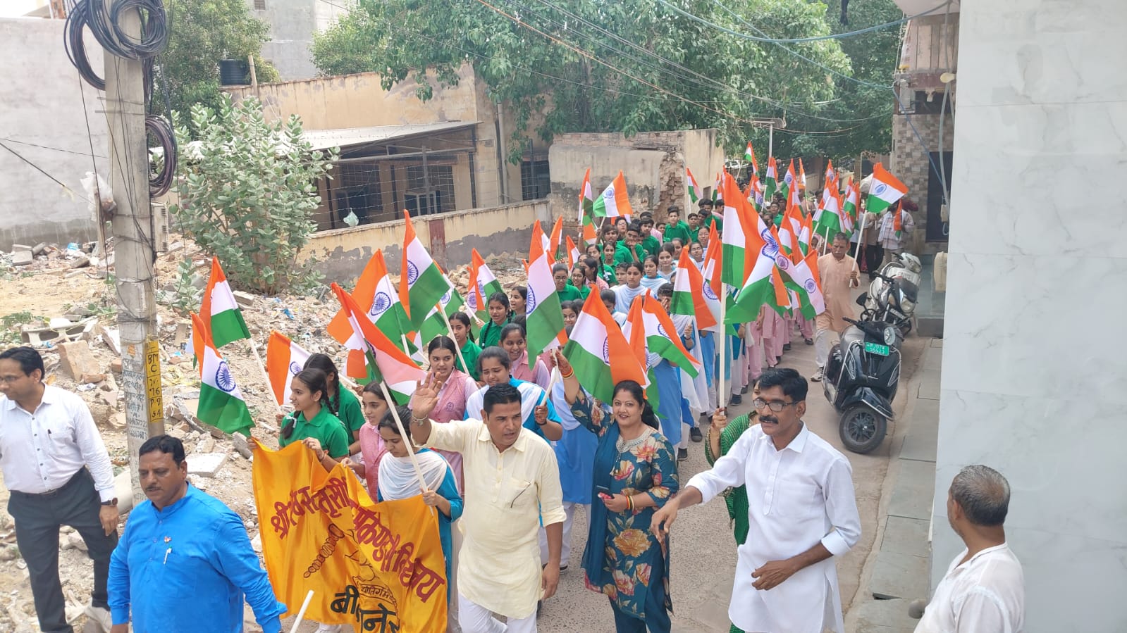 इस अवसर पर बीकानेर पश्चिम के विधायक श्री जेठानंदजी व्यास ने स्कूल के सभी विद्यार्थियों को हर घर तिरंगा फहराने के लिए प्रोत्साहित किया और विधायक जी ने अपने उदबोधन में स्कूल के सभी विद्यार्थियों एवं कार्यकर्ताओं को कहा कि आज हम सब यहाँ एकत्रित हुए हैं उस ऐतिहासिक दिन को याद करने के लिए जब 15 अगस्त 1947 को भारत ने ब्रिटिश शासन से आज़ादी प्राप्त की। यह सिर्फ एक तिथि नहीं बल्कि अनगिनत बलिदानों संघर्षों और सपनों का परिणाम है।हमारे स्वतंत्रता संग्राम सेनानियों ने न केवल अपने प्राणों की आहुति दी बल्कि आने वाली पीढ़ियों के लिए एक स्वतंत्र भारत का सपना भी साकार किया। भाजपा मंडल अध्यक्ष विशाल गोलछा ने बताया कि इस तिरंगा यात्रा रैली का उद्देश्य स्कूलों के बच्चों में एवं जनता में देश के प्रति सदभावना जागृत हो सके। भाजपा जिला प्रवक्ता जोगेंद्र शर्मा ने बताया कि हमारा राष्ट्रीय ध्वज केवल तीन रंगों का कपड़ा नहीं है यह हमारे वीर शहीदों के बलिदान हमारी स्वतंत्रता और हमारी एकता का प्रतीक है। इस अवसर पर भाजपा जिलामंत्री किशन चौधरी ने कहा कि इस अभियान का संदेश है “घर-घर तिरंगा,दिल में भारत” जब हम अपने घर पर तिरंगा फहराते हैं, तो हम दुनिया को यह संदेश देते हैं कि भारत एकजुट है मजबूत है और अपने गौरव पर गर्व करता है। जिलामंत्री रामचन्द्र सोनी ने कहा कि मैं आप सभी से निवेदन करता हूँ कि 13 से 15 अगस्त के बीच अपने-अपने घर, कार्यालय,दुकानों और संस्थानों पर तिरंगा अवश्य फहराएँ तिरंगे का सम्मान करना और उसे सही तरीके से फहराना हमारा कर्तव्य है। और भाजपा पूर्व जिला उपाध्यक्ष एवं जिला सदस्य एडवोकेट कुंदन सोनी ने विद्यार्थियों ओर कार्यकर्ताओं की तरफ हाथ बढ़ाते हुए कहा आओ इस बार आज़ादी का अमृत महोत्सव हम सब एक साथ पूरे जोश और गर्व के साथ मनाएँ ताकि आने वाली पीढ़ियाँ भी देशभक्ति की इस परंपरा को आगे बढ़ाएँ।